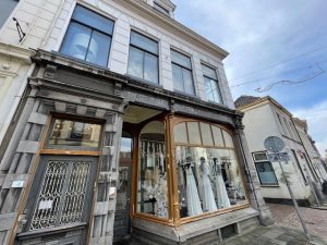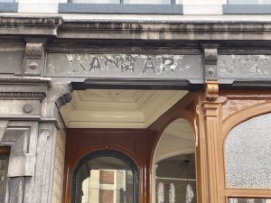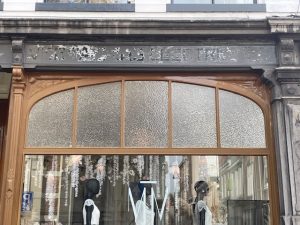 Kamperstraat 35 Zwolle, een voormalige koperslagerij (wat mijn eerste project was). Nu komt tekst van latere jaren met een heel mooie art-deco letter boven water. We moeten nog onderzoeken hoe het precies is gemaakt, het lijkt zwart glas met uitgespaarde letters.